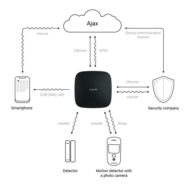 Основой системы является хаб, получающий сигналы от датчиков. В случае обнаружения подозрительной активности хаб посылает тревожное оповещение пользователю и при необходимости на пульт охраны.